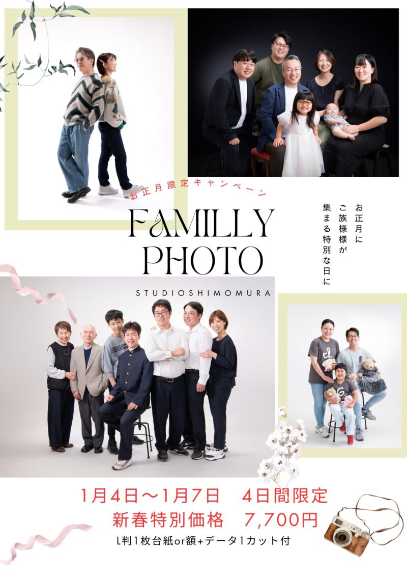 【新春特別】家族キャンペーン 2025.12.26 お知らせ 日頃の感謝を込めて当店初めての新春特別キャンペーンを開催いたします㊗️ ご家族様が集まるお正月にぜひお待ちしております❗ お大師様の初詣でついでに「家族写真」を残しませんか? 家族写真の大切さを感じていただくために毎年開催していこう考えております😊 普段着はもちろん着物、ユニフォームなんでもOKです📸 毎年の恒例行事にしませんか? スタッフ一同お待ちしております🎍